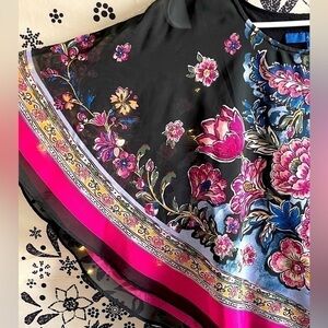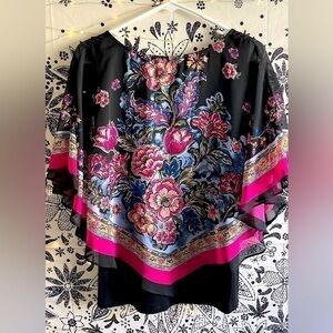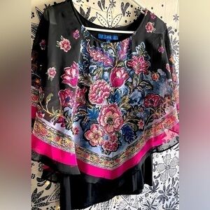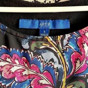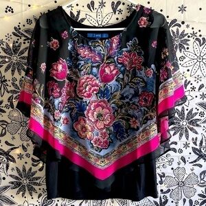 Apt 9 black and pink floral print flowy overlay blouse. Stretch tank under a flowy triangular top, very unique and eye catching! Also flattering and accommodating to different sizes, this is listed as a small but I actually wore it as a size L. I'm listing it as a medium to hit the in-between!
