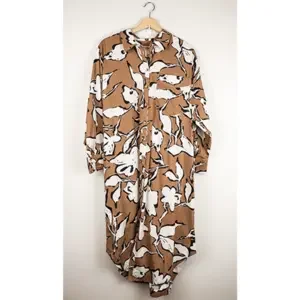 Stylish midi dress with bold floral print. Features button-down front and rolled sleeves. Perfect for casual outings.