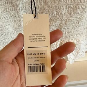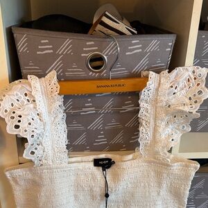 Elegant white crop top with eyelet lace straps. Smocked texture and delicate hem. Ideal for summer style. The brand is called ME + EM and this is a US size 10 top. It is very stretchy. It is 100% cotton. It’s in perfect condition with the tags still attached! The bust on stretched is about 16 1/2 inches and top to bottom is about 13 inches. I accept reasonable offers! Bundle two items or more and save 30%! BUY now is my closet will close as soon as I’m fully recovered from a broken leg and make the leap back to my ancestral village in Greece to begin my wellness retreats there again! Follow my journey on TikTok at Zoe yoga lifestyle, or join my monthly newsletter at zoeyogalifestyle.com and thank you for supporting my small business and dreams!