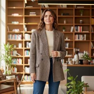 Beautifully tailored with a structured silhouette and classic brown plaid pattern. The 55% silk / 45% wool fabric gives it that soft, elevated drape while still holding shape — true quiet luxury energy.