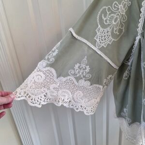 ✨ Beautiful boho-inspired Democracy peasant style top in a soft sage green featuring intricate white embroidered detailing and lace trim throughout.