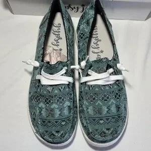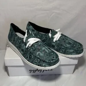 Teal slip-on shoes with geometric patterns. Features white laces. Crafted by Gypsy Jazz.