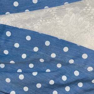 Step out in charming vintage style with this lovely light blue polka dot dress. Featuring a flattering peplum waist and a deep V-neckline adorned with delicate white lace, this dress is perfect for a retro-inspired look. The three-quarter sleeves add an elegant touch. Excellent pre-owned condition, ready to wear for a special occasion or everyday flair.