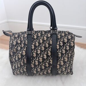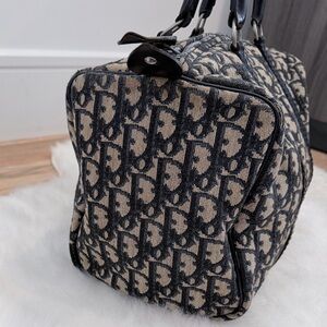 Beautiful and classic Dior Boston style handbag featuring the iconic monogram canvas with navy leather trim and structured top handles. Timeless design that’s perfect for everyday wear or adding a vintage designer touch to any outfit.