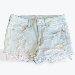 American Eagle Hi-Rise Shortie Distressed Lace Trim Denim Shorts Light Wash 6