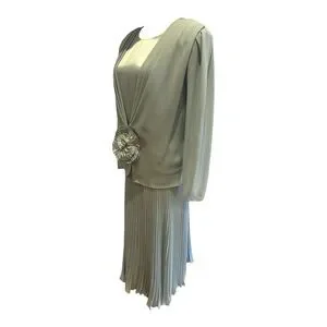 Crafted in flowing blue chiffon with satin accents, this dress features a graceful micro-pleated midi skirt that moves beautifully with every step. The structured bodice showcases classic 1980s tailoring with subtle padded shoulders for shape, delicate pearl-like buttons, and a romantic floral bloom accent for that soft, celebratory finish.