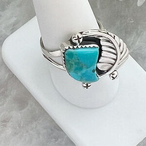 Tiger Tooth Shaped Mohave Turquoise Ring Size 9 Sterling Silver 925 Vintage Native Southwestern Style Handmade New without tags. Unique leaf detail. Comfortable to wear. Well made ring. Tested and verified sterling silver 925.
