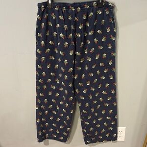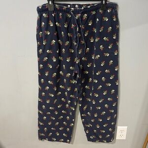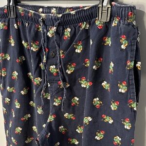 Comfortable navy pajama pants featuring a colorful floral print. Perfect for lounging. These pants are estimated to be from the 1990s when the polo bear was their popular print. There is wear along the waistband and drawstring holes.