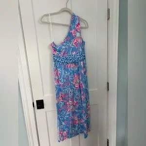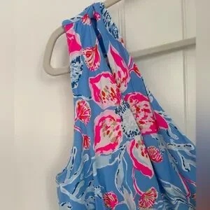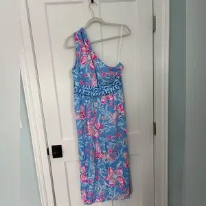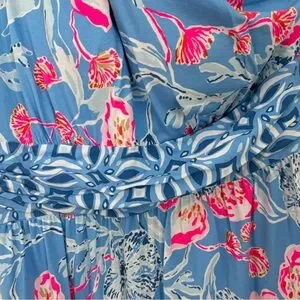 Charming dress with vibrant floral design. Features a mix of blue and pink hues.