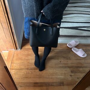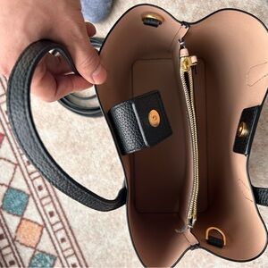 Chic Tory Burch satchel in black pebbled leather. Features dual handles and adjustable strap. Gold logo accent adds elegance.