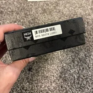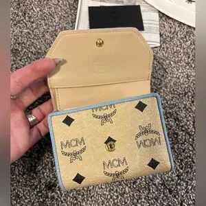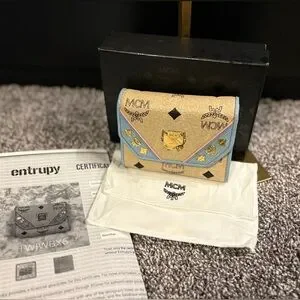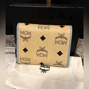 MCM Visetos Trifold Beige and blue Leather Wallet