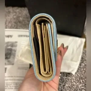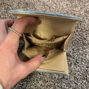 Multiple compartments. Multiple credit card slots two ID clear compartments snap coin compartment inside with a mini zip compartment. Please see all photos of condition.