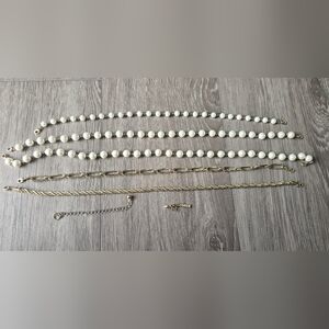 Includes 5 separate strands – 3 pearl sizes (small, medium, large), link chain, and thicker textured chain.