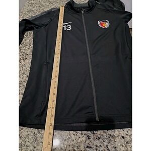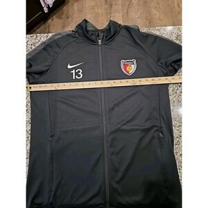 Small flaw photoed left arm. The product is a Nike Houston Texans full zip jacket, featuring the team's logo and colors. This officially licensed NFL jacket is designed for men in size Large and is perfect for showing support for the Houston Texans during football season. The jacket's black color and sleek design make it a stylish and comfortable choice for any fan looking to represent their favorite team.