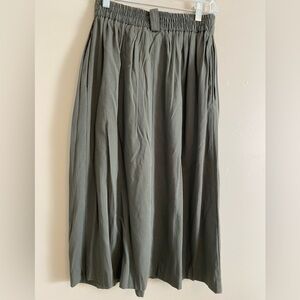 This elegant olive green Metro New York skirt features a stylish pleated button-down design, perfect for any occasion. Its versatile color makes it easy to pair with your favorite tops. Made in USA of 60/40 Rayon/Polyester with belt loops and side pockets. Size 10 Waist 13” Length 29”