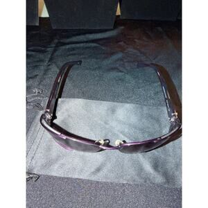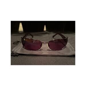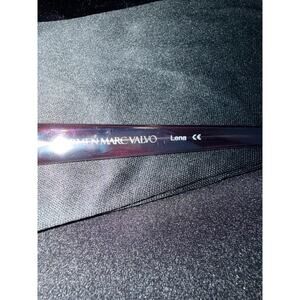 The sunglasses in the image are the Lena model by Carmen Marc Valvo. This particular vintage style is characterized by its purple/burgundy oval-shaped frame and was handmade in Japan. These are beautiful, barely used shape, I do not see any scratches.
