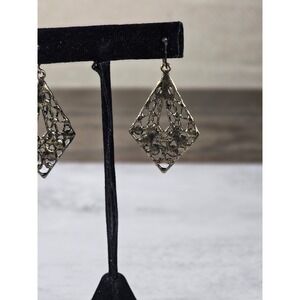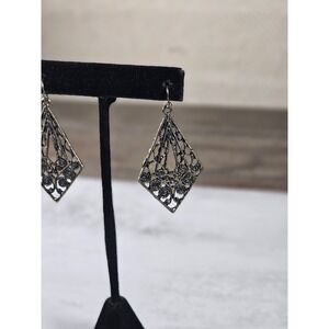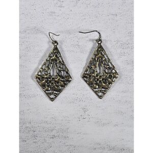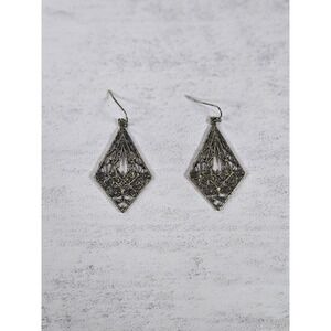 These vintage filigree dangle earrings feature an intricate openwork design in a diamond silhouette. The detailed metalwork showcases delicate scroll patterns and small raised floral accents along the lower portion, giving them a romantic, antique-inspired look.