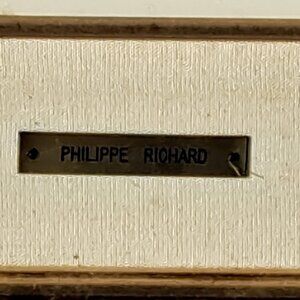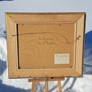 An oil painting made by the Quebec artist Phillipe Richard titled "Fin Du Journee Sur Le Richelieu (end of the day on the Richelieu)" that was made in 1989. It depicts a house by the shore of the Richelieu River with a man bringing in a boat. A village and church are in the background on the other side of the river. The frame is 27 1/2" wide by 23 1/2" in height while the painting itself is 19 1/4" by 15 3/4". Note the stains on the fabric of the frame.