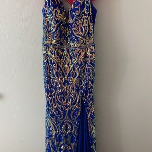 Ellie Wilde sequin prom dress. Dress was never worn due to Covid cancellation of prom. Dress is a size 16, but was professionally altered to an approximate size of 12 for a 5’5” female before prom was cancelled. I believe it would also easily fit a size 14 since it ties down the back. Padding was added to the bust area during the alteration. Original price was $495