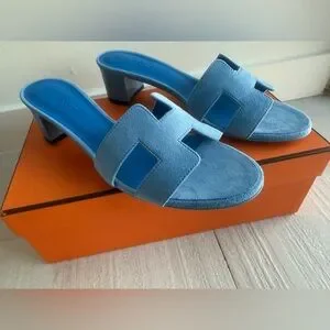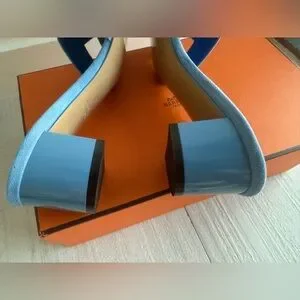 Elegant Hermes sandals in a striking blue. Features a comfortable block heel and signature design.