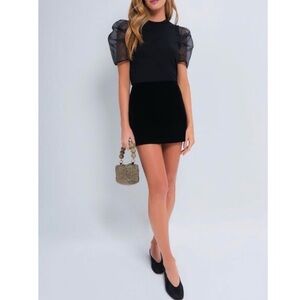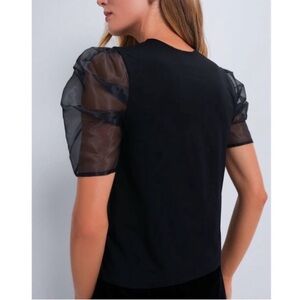This elegant black top features stylish sheer sleeves, perfect for any occasion. Its classic design offers a sophisticated look.