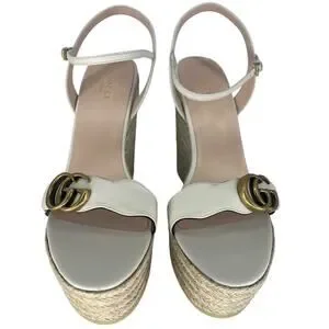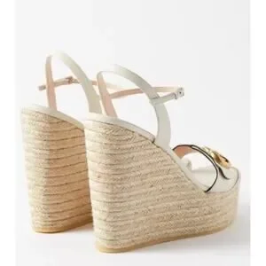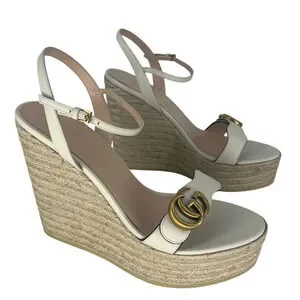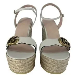 Gucci Aitana Marmont GG Logo Leather Platform Espadrilles Wedge Sandals in White