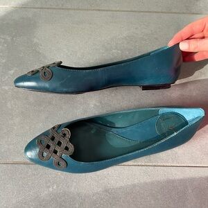 Diane Von Furstenberg Teal ballet Flats w micro chain gunmetal Embellishment 7