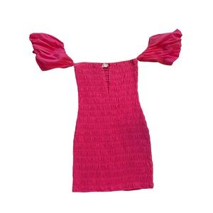 Seven Wonders Hotel Pink Smocked Off The Shoulder Cotton Mini Dress. Made from 100% cotton fabric, this dress boasts an off-shoulder neckline, adding a hint of glamour to your look. The puff sleeves bring a playful and trendy vibe to the dress. Whether you're hitting the dance floor or attending a stylish event, this mini dress promises to make a statement with its alluring design and fashionable silhouette. 100% cotton