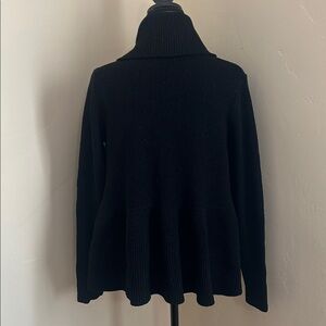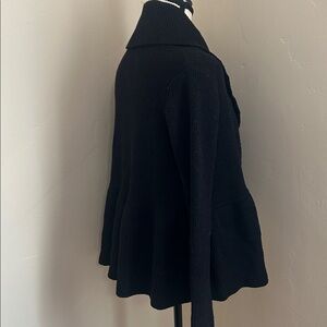 Diane Von Furstenberg Open Peplum Cardigan. Fabric is ribbed black shimmer, 92% wool. Great condition. Purchased years ago at Barney’s New York but only worn a few times.