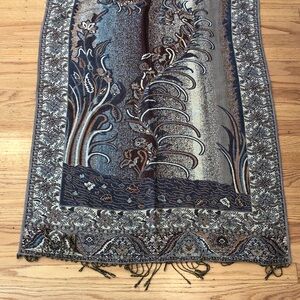 This golden shimmery scarf features a beautiful floral pattern in shades of red, blue and brown. Perfect for adding a touch of sophistication to any outfit.