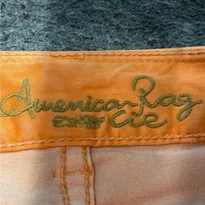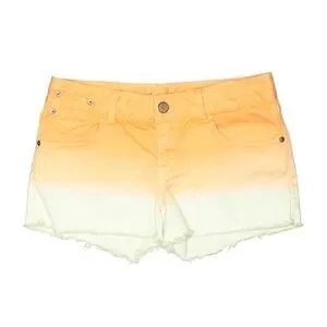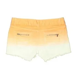 Orange and white denim; 5 pockets (3 front/2 back with zippers); button front close; 3” front zipper; 3” inseam; distressed bottom hem; size 5 (Junior’s)