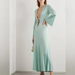 Elegant light blue coverup. Features deep V-neck and long sleeves. Perfect for beach or poolside.