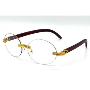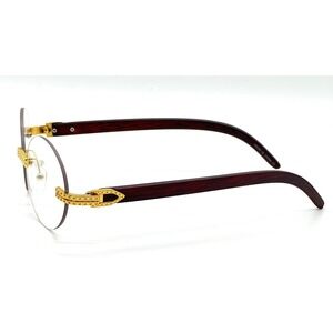 Elegant eyewear featuring a distinctive rimless design with round lenses, perfect for adding a touch of sophistication to any look. These glasses showcase eye-catching gold accents that complement the rich, wood-like arms, creating a harmonious blend of classic and contemporary styles. The lightweight construction ensures comfortable wear, while the unique design makes a bold fashion statement. Ideal for completing a smart-casual ensemble, adding flair to a professional outfit, or elevating your everyday style.