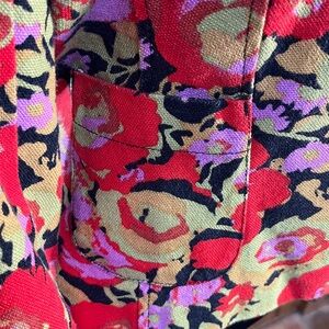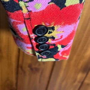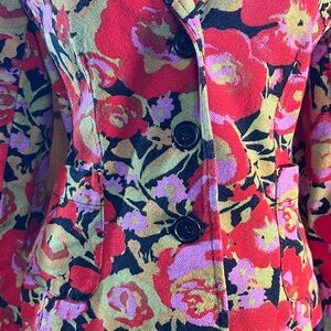 Isaac Mizrahi size small floral blazer. Vivid red, black green and purple flowers. Front pockets, classic styling. Clean with no damage.