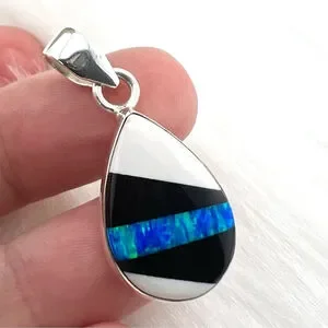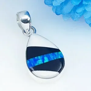 Blue Fire Opal Pendant Pure Sterling Silver 925 Shell Onyx Inlay Stripe New
