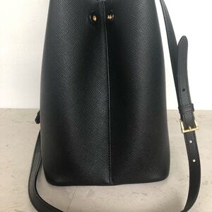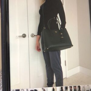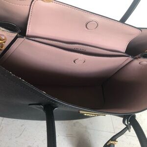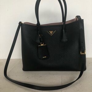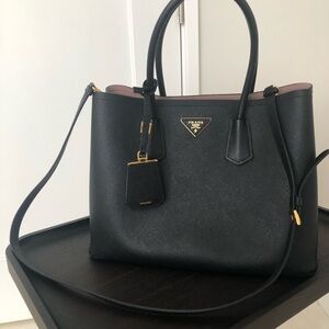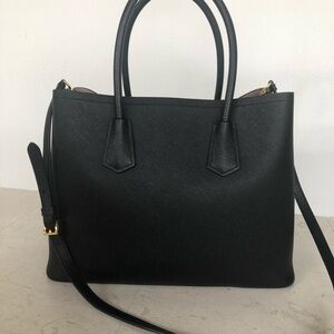 Chic Prada tote in black Saffiano leather. Features dual handles and a detachable strap. Iconic triangle logo detail. Blush leather lining, two large separate compartments inside. Roomy interior , that makes it ideal for work, travel, commuting, or everyday carry.