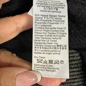 Madewell Pointelle Stitch Cardigan in an alpaca blend black knit, style NW803, is crafted from a 62% alpaca and 38% polyamide blend designed for warmth without bulk and a soft hand feel. Alpaca fibers are known for their lightweight insulation and durability, offering warmth while remaining breathable. The delicate pointelle stitch construction enhances airflow and texture while maintaining structure. Designed in a relaxed fit with shell button front closure and a length that hits between the bellybutton and high hip.