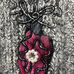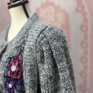 Vintage grey marled knit cardigan with bold floral appliqué detailing in purple and magenta, finished with pearl bead centers and embroidered accents. Soft textured knit with statement buttons.