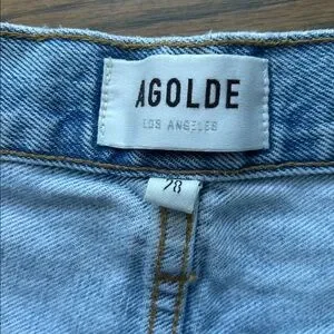 Stylish ripped jean shorts by Agolde. Light blue with a casual, edgy look.
