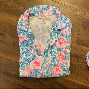 Lilly Pulitzer Pajama Set, size L. In good condition, pants are just missing the drawstring. The elastic on the waistband is stretchy enough that it wasn’t a problem for me! There’s also a couple small tears on the inside of the waistband, as pictured