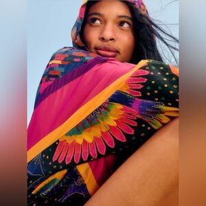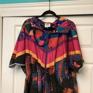 Vibrant jumpsuit with a bold multicolor pattern. Features a zip-up front and drawstring waist. Perfect for a standout look.