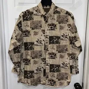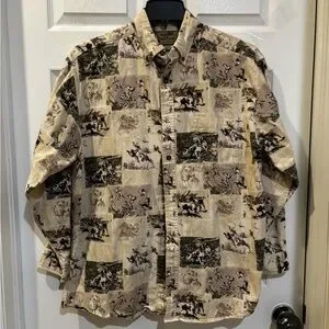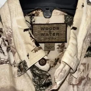 Woods & Water Outfitters Men's dog pheasant long sleeve hunting shirt size L.100% cotton all over print ,center back pleat with locker loop ,curved hem,two button adjustable sleeve .Pre-owned excellent condition new like condition no visible signs of wearing no flaws