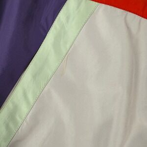 Urban Outfitters windbreaker jacket features a retro-inspired colorblock design in lavender, purple, red, and mint green. Constructed from lightweight polyester with a breathable mesh lining, this full-zip jacket includes a high neck with adjustable drawstrings and elasticized cuffs and hem for a secure fit. The relaxed, slightly cropped silhouette offers a vintage 90s aesthetic perfect for layering. Please note a small faint mark on the front as shown in photos.