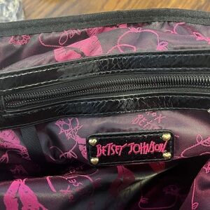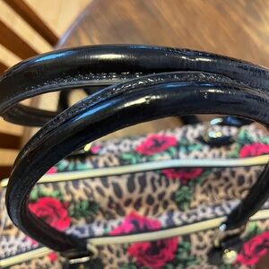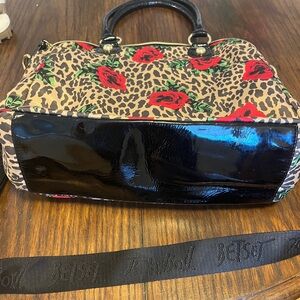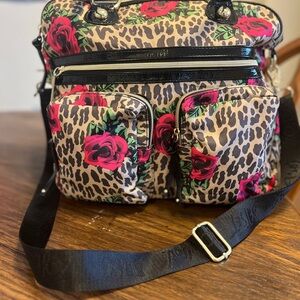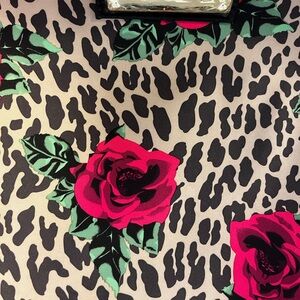 Stylish bag with leopard print and vibrant red roses. Perfect for a bold look. Deep double pockets on the top with zip closures. Three pockets on the front. Removable crossbody Betsy Johnson strap. Excellent condition like new. One call out on satchel strap, very small