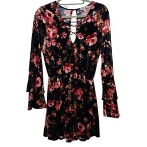 Charlotte Russe Floral Crushed Velvet Romper size small new with tags still attached. Romper has beautiful bell sleeves with a peephole back. The p2p is 19 with a length of 33. The material is 96% polyester and 4% spandex. Does come from a pet friendly home.