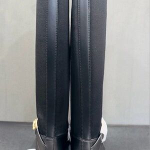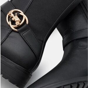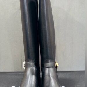 Coach black riding boots with gold carriage buckle details. Perfect for any occasion.