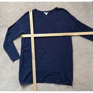 Eileen Fisher navy longline sweater with front patch pocket in soft organic cotton blend knit. Minimalist capsule wardrobe essential perfect for layering. Timeless relaxed fit.