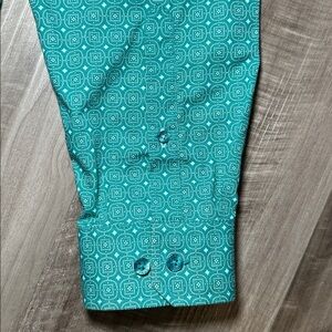 Item is preowned. Color is Green, Light Turquoise and Ivory. Material is Cotton (100%). Size is a Men’s Small.