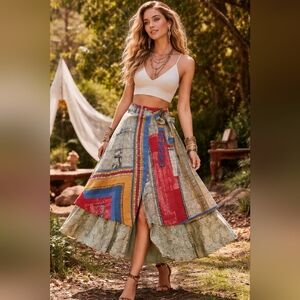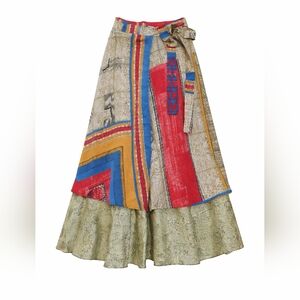 Experience ultimate versatility with this stunning, reversible Indian wrap skirt. Crafted from 100% Silk and made in India, this lightweight piece features two distinct layers with unique patterns. One side showcases a bold, geometric Oriental-inspired print in red, blue, and yellow, while the other reveals a delicate floral motif in a muted sage green. The wrap-around design ensures a flattering, adjustable fit for various body types.