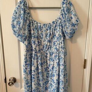 Charming blue floral dress. Puff sleeves. Lightweight fabric. Perfect for casual outings.